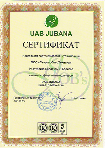 ООО "СтартерСпецтехника" является официальным дилером компании UAB JUBANA (Литва) и реализует стартеры и генераторы для автомобилей и сельхозтехнике, а также запчасти к стартерам и генераторам.